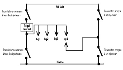 On remarque que les quatre injecteurs sont alimentés en commun sur l'une de leurs bornes et individuellement sur l'autre, ce qui permet l'inversion de leurs polarités.