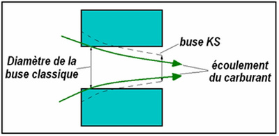 Pour limiter ce comportement néfaste à la longévité de l'injecteur, Bosch réalise des buses du type « KS » dont les trous ont une forme conique :