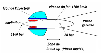 L'amélioration de la fiabilité dans le temps de l'injecteur (très sollicité) passe, entre autre, par une évolution du process de réalisation de la buse. Les orifices réalisés dans la buse grâce au principe de l'électroérosion (dont le diamètre est de l'ordre 110 µm) ont une forme rectiligne. Lors de l'ouverture de l'aiguille de l'injecteur, il se crée un phénomène de cavitation qui perturbe l'écoulement du carburant (modification du débit injecté) et favorise l'arrachement de matière dans la buse.