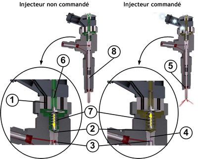 Ouverture de l'injecteur : Piloté par le calculateur sous une tension de 80 volts, l'actionneur électromagnétique déplace la bille de commande (2). La pression dans la chambre de commande (3) chute par l'ajutage du circuit de retour (4), la force F1 sur le piston de commande de l'aiguille (8) diminue. Le piston de commande et l'aiguille de l'injecteur se soulèvent.