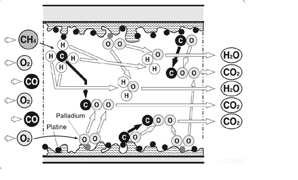 Pour la réaction chimique, le catalyseur est imprégné de matériaux précieux comme le platine et le palladium. Ces matériaux vont oxyder le CO et les HC pour les transformer en CO2 (dioxyde de carbone) et H2O (eau).