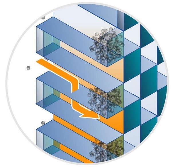 Le filtre à particules est composé de multiples canaux obstrués à leurs extrémités. Les parois poreuses de chaque canal laissent passer les gaz d'échappement mais retiennent les particules de suies.