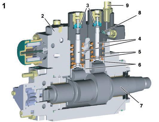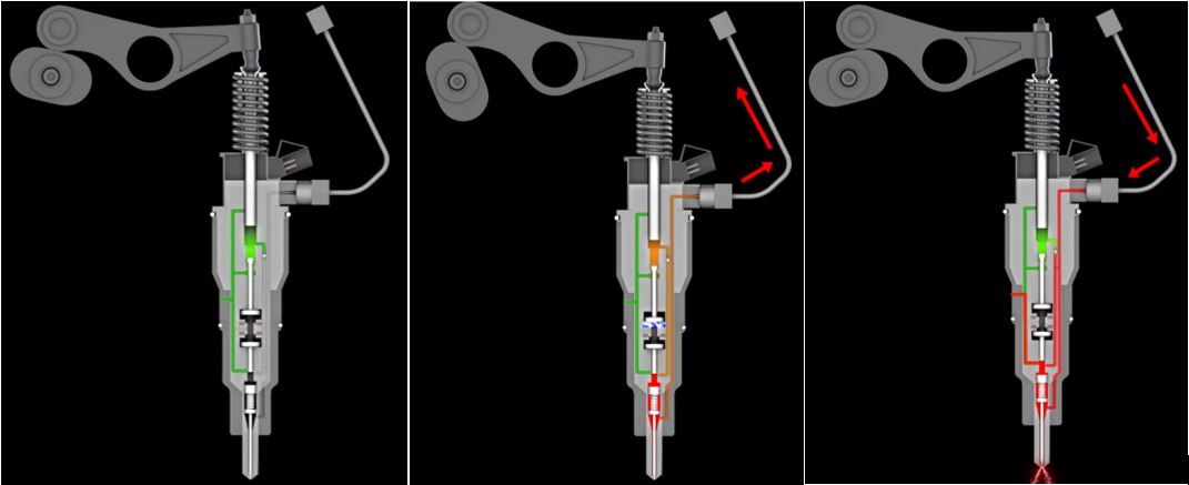 Ce système est équipé de 3 injecteurs pompant et de 3 injecteurs haute pression. Les éléments pompant sont actionnés mécaniquement par des cames.