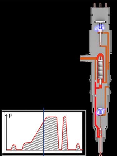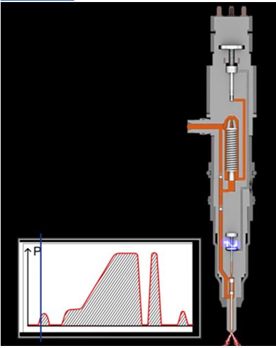 - · L'injection s'effectue avec une montée progressive de la pression = elle débute à la pression rail, puis augmente au fur et à mesure de l'amplification.