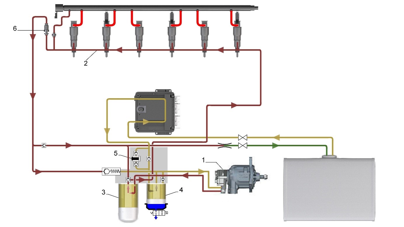 Comme les systèmes d'injection à injecteurs pompes, la pression du circuit d'alimentation de carburant est régulée par l'intermédiaire d'un clapet de balayage situé en sortie de culasse.