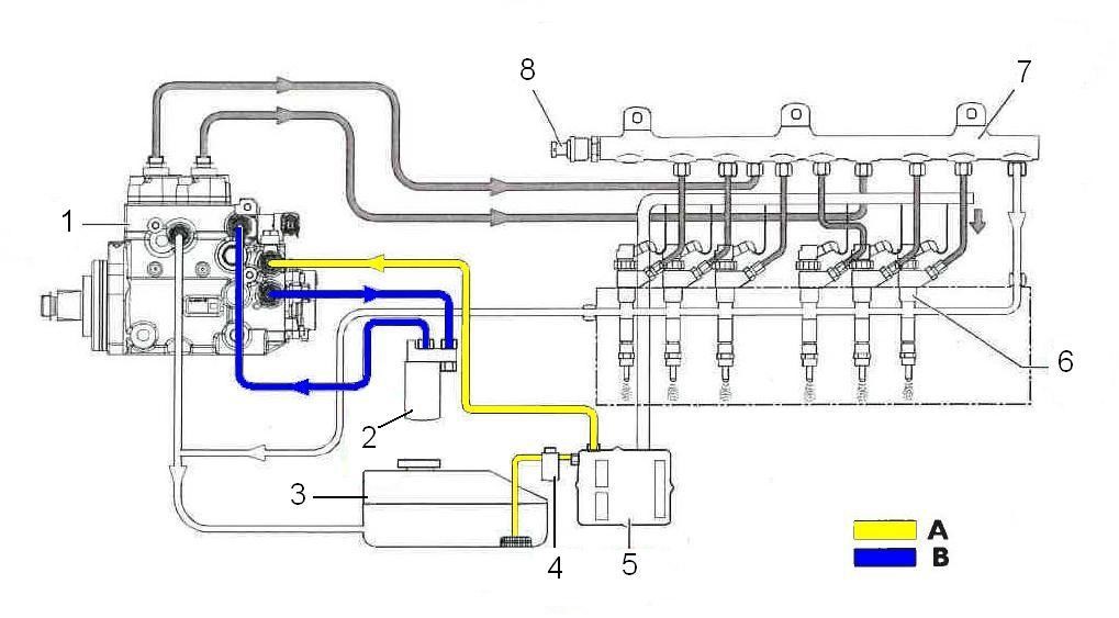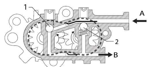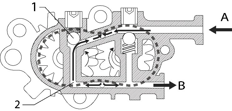 La soupape de dérivation (2) s'ouvre quand, lorsque le moteur est éteint, le circuit de carburant doit être rempli via la pompe d'amorçage ou par l'intermédiaire d'un remplissage extérieur. Dans cette situation, la soupape de dérivation (1) reste fermée alors que la soupape de dérivation (2) s'ouvre en raison de la pression d'entrée. Le carburant est ainsi évacué via la sortie B.