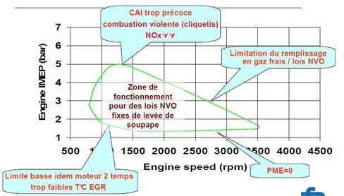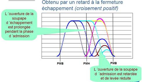 Grâce à la distribution variable, on réalise un croisement de soupape négatif, ce qui permet de re-comprimer les gaz d'échappement et ainsi de réchauffer les gaz frais.