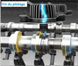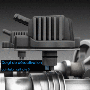 - Lorsque le système est actif (les électrovannes "admission" et "échappement" sont commandées), les loquets sont repoussés par la pression d'huile du moteur et déverrouillent les basculeurs (débrayable et principal), les soupapes du cylindre N°1 ne sont plus actionnées. Le moteur fonctionne sur 2 cylindres.