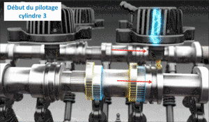 Pour réactiver les soupapes, le calculateur de gestion moteur pilote simultanément les actionneurs d'échappement et d'admission en respectant toujours l'ordre d'allumage. Le cylindre 3 est réactivé avant le cylindre 2. C'est le doigt d'activation (ici en jaune) qui rentre en contact avec la rainure hélicoïdale du bloc multicame. Le moteur fonctionne alors sur 4 cylindres.