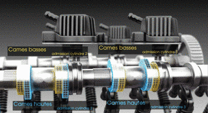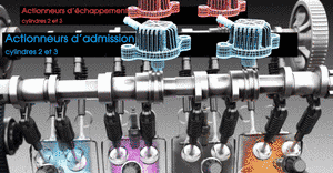 - Chaque arbre à cames est doté d'un bloc multicame mobile qui agit sur l'attaque des soupapes du cylindre N°2 et N°3.