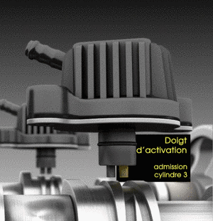 - Lorsque le système est en position repos (les électrovannes "admission" et "échappement" ne sont pas commandées), les loquets verrouillent les basculeurs (débrayable et principal), les soupapes du cylindre N°1 sont actionnées. Le moteur fonctionne sur 3 cylindres.