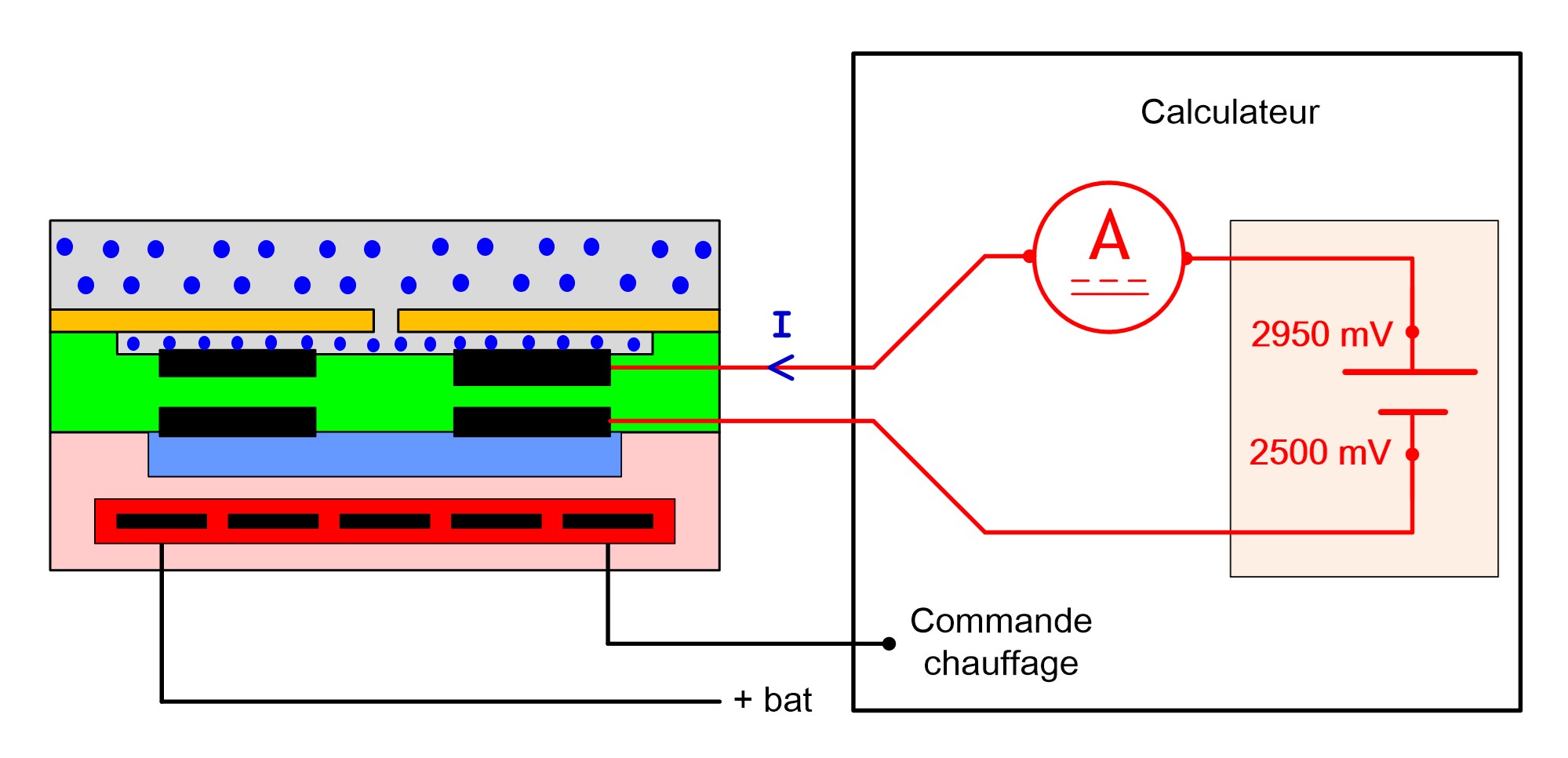 Le calculateur applique une différence de potentiel d'environ 0,45 V sur les 2 électrodes de la sonde.