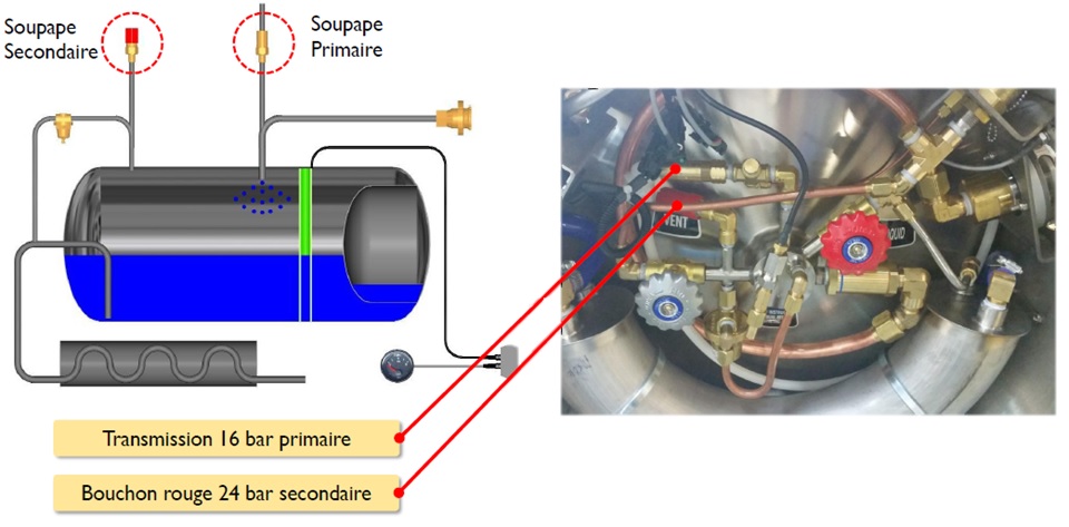 Lors du remplacement des soupapes de sécurité, il est nécessaire de réaliser la vidange complète du réservoir (prendre connaissance de la méthode préconisée avant d'intervenir).