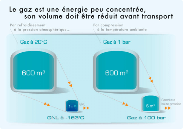Après traitement, la liquéfaction permet de condenser le gaz naturel en GNL en réduisant son volume d'un facteur de près de 600 pour un même pouvoir calorifique, ce qui facilite son transport par voie maritime.