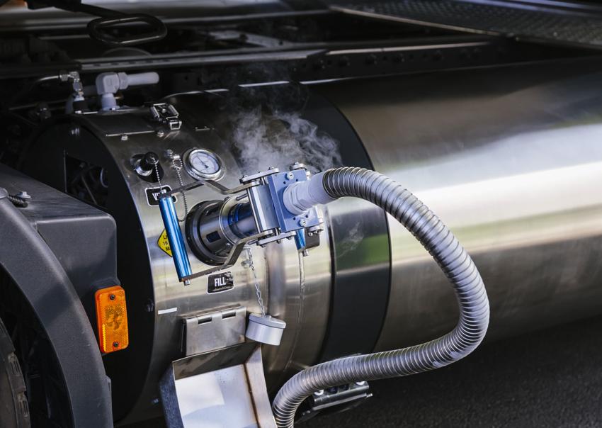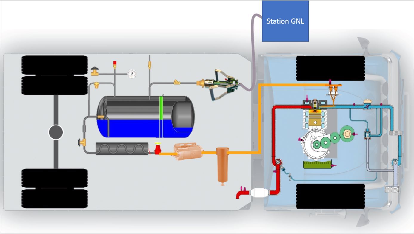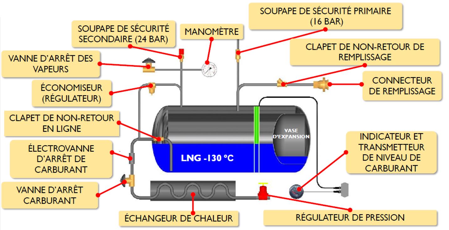 Le GNL est maintenu à l'état liquide à - 160°C (1,2 bar) puis réchauffé à -130 °C (7,5 bar) pour être saturé et retrouver de la pression dans le réservoir du véhicule.