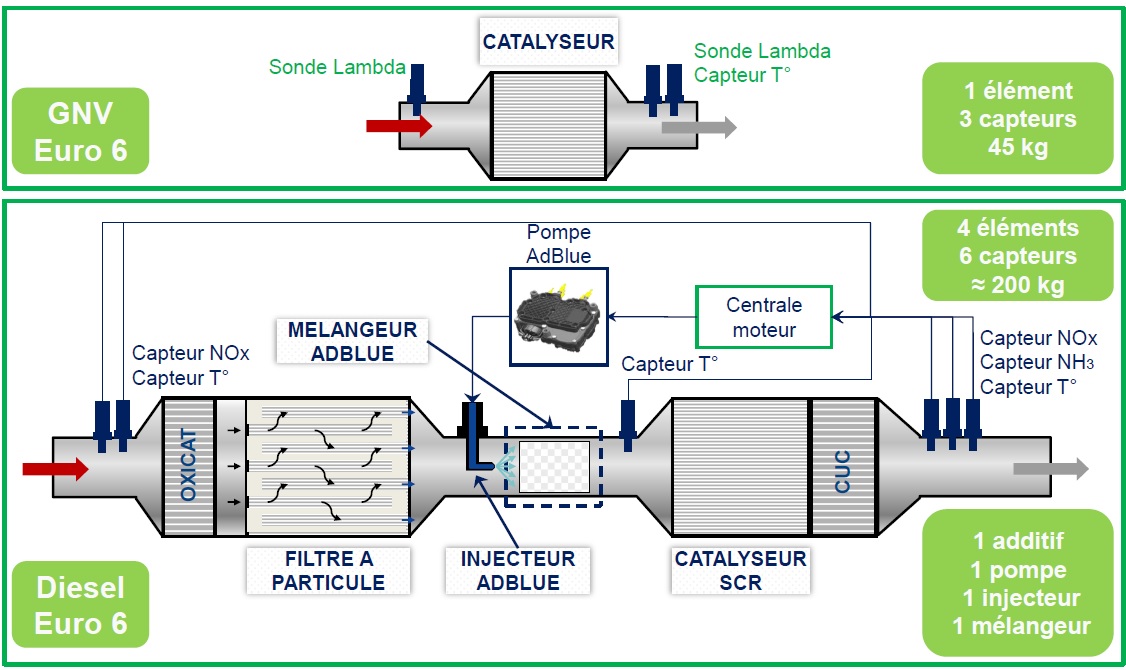 Les émissions polluantes : avec très peu de particules et moins d'oxyde d'azote (Nox) en comparaison au gasoil, les véhicules roulants au GNV répondent très largement à Euro 6.