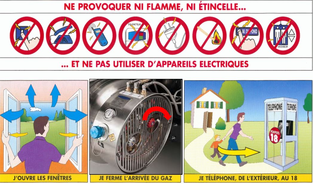 - Suspendre tout travail à feux nus, tout mouvement de véhicule et tout fonctionnement d'appareil susceptible de provoquer des étincelles ou des flammes.