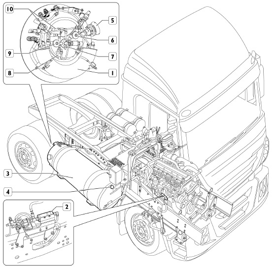 Elle limite la pression à 16 bar dans le réservoir (parfois causée par l'immobilisation prolongée du véhicule) et dirige la surpression vers le tuyau d'évacuation derrière la cabine.