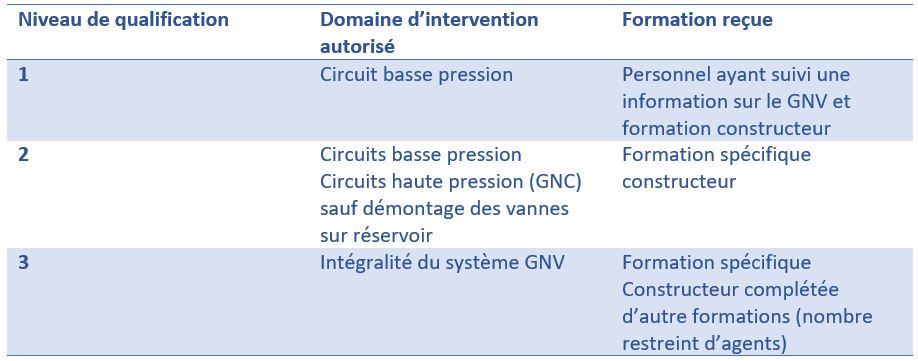 - Formation qualifiante du personnel intervenant sur le réseau GNV du véhicule (voir tableau).