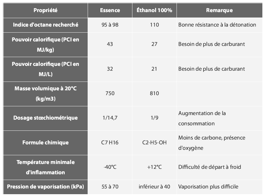 L'éthanol a un pouvoir calorifique inférieur de 35% par rapport à l'essence. Il a cependant une masse volumique supérieure. Lorsqu'un moteur fonctionne à l'E85, une surconsommation d'environ 30% par rapport à l'essence est prévisible. L'éthanol a un indice d'octane (RON) supérieur à l'essence (110).