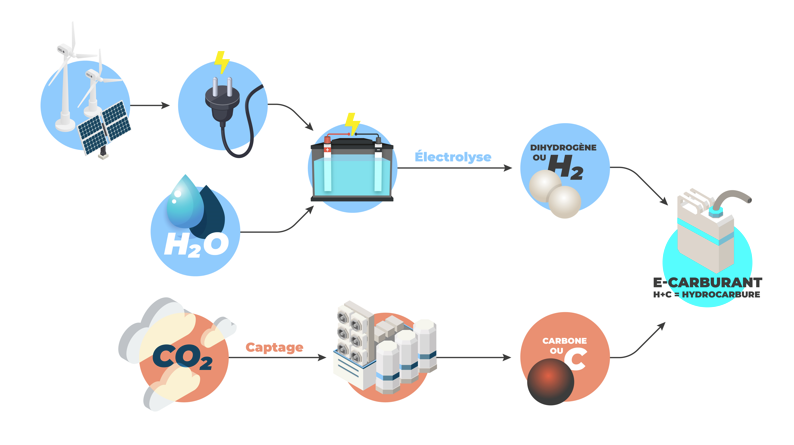Ces carburants sont produits à partir d'hydrogène et de dioxyde de carbone (CO2) capturé.