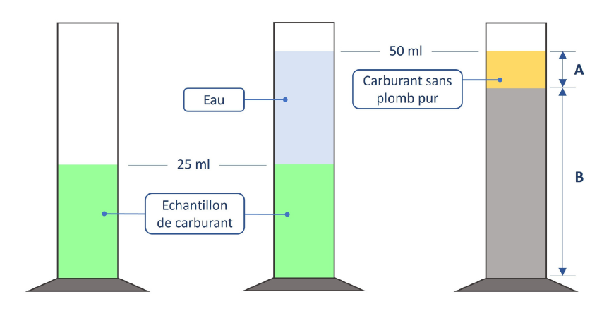 - Après quelques secondes, le mélange se sépare en 2 volumes. La quantité « A » qui remonte à la surface représente le carburant sans plomb pur, présent dans l’échantillon initial,