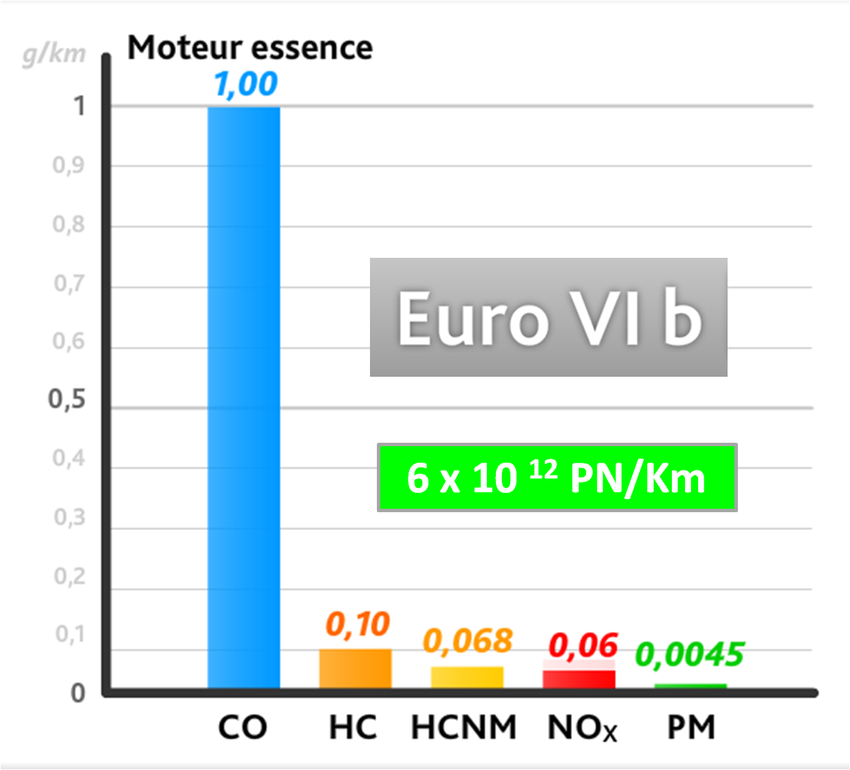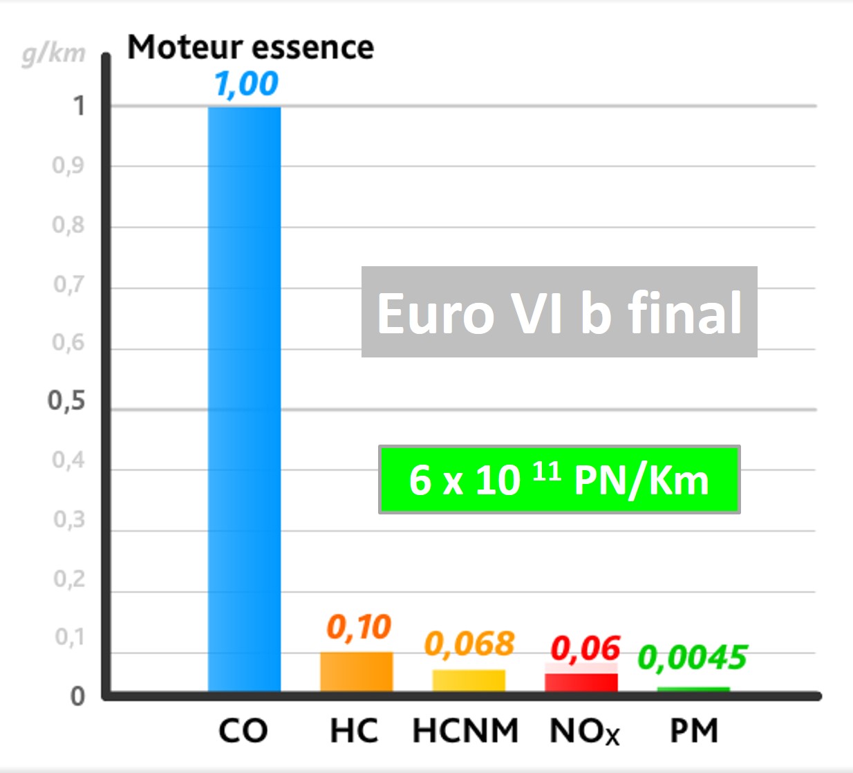 Le seuil du nombre de particule est abaissé, il devient identique au seuil imposé aux véhicules diesel en « Euro 6b » (6x1011 PN/km).