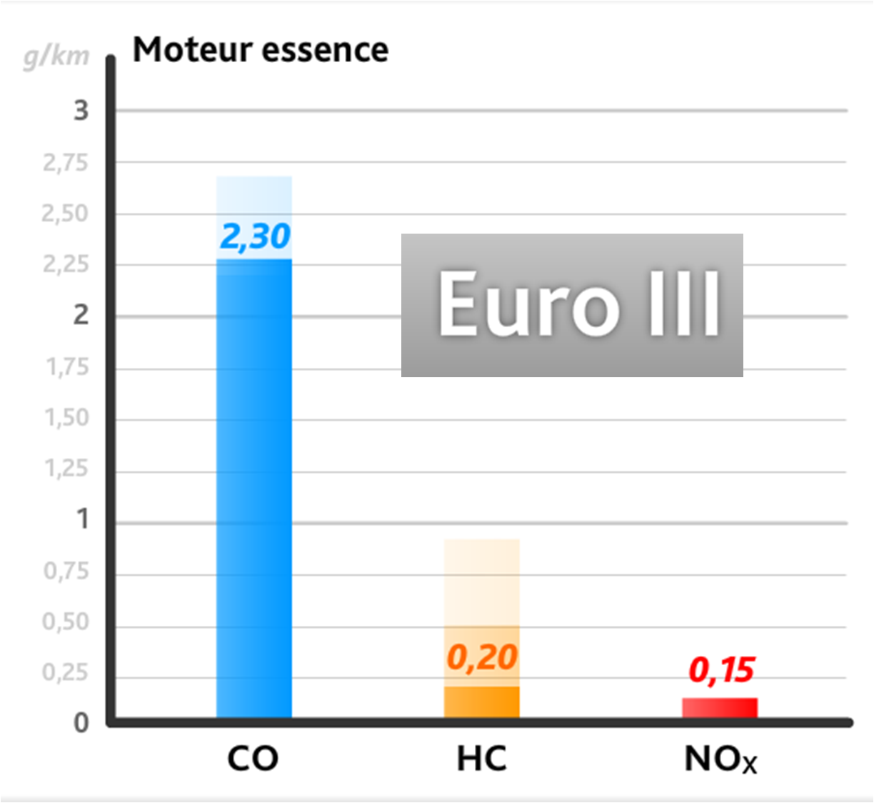 Le prélèvement des gaz débute des le début du cycle (suppression des 40 secondes de mise en route). Les rejets de CO remontent à 2,3 g/Km contre 2,2 g/Km en « Euro 2 » pour compenser les 40s de prélèvement à froid. Les rejets d'HC et de NOx sont mesurés séparément.