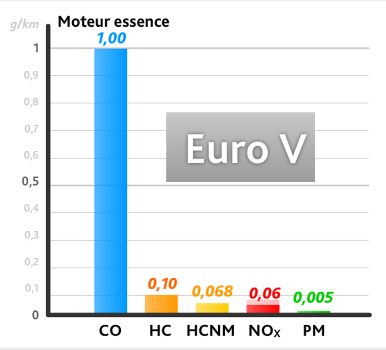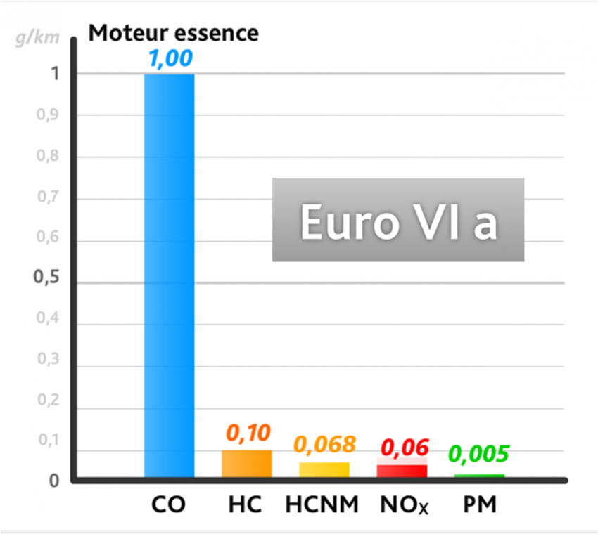 Les seuils sont identiques à « l'Euro 5 » pour les véhicules essence. Ils sont abaissés pour les véhicules diesel.
