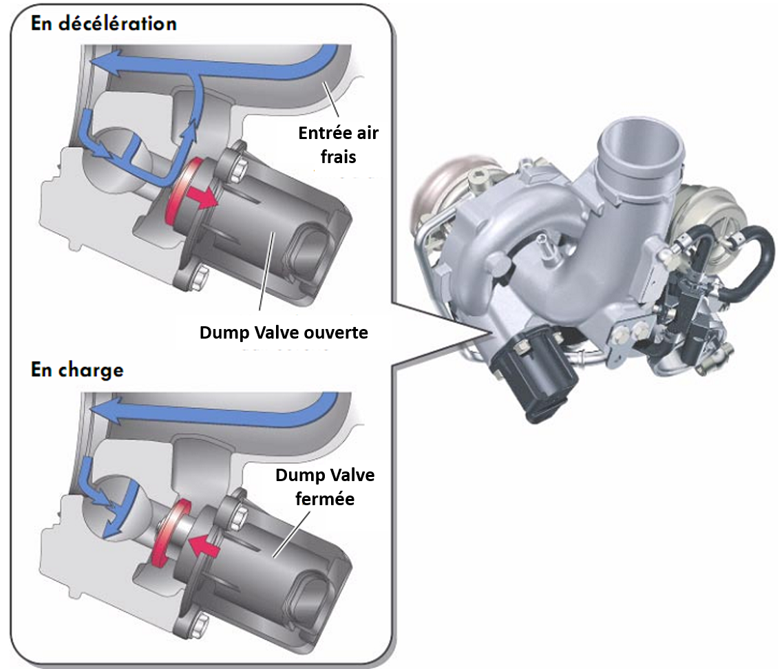 La Dump Valve est fermée au repos. Lors d'une phase d'accélération, si le papillon des gaz se ferme brutalement, elle ouvre un canal de dérivation qui dirige l'air comprimé (sortie compresseur) vers l'admission (entrée compresseur). La roue du compresseur conserve ainsi sa vitesse. Lors de la réouverture du papillon des gaz, la vanne se referme et la pression de suralimentation est immédiatement disponible.
