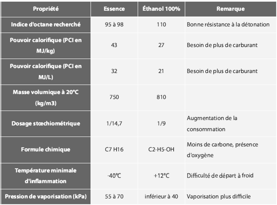 L'éthanol a un pouvoir calorifique inférieur de 35% par rapport à l'essence. Il a cependant une masse volumique supérieure. Lorsqu'un moteur fonctionne à l'E85, une surconsommation d'environ 30% par rapport à l'essence est prévisible. L'éthanol a un indice d'octane (RON) supérieur à l'essence (110).