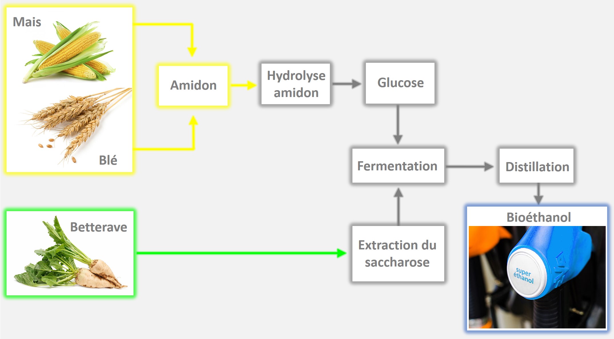 L'éthanol de première génération est obtenu par un procédé de fermentation industrielle permettant de transformer le sucre contenu dans les végétaux en alcool. Les végétaux utilisés sont classés en deux grandes catégories :