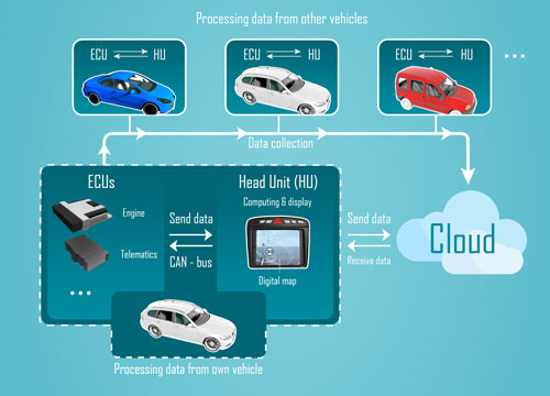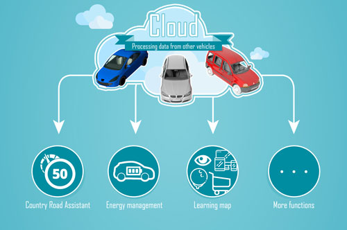 - La gestion des données sur le « cloud » pour la navigation et la régulation de vitesse en temps réel via la mise à jour des informations de trafic, de roulage ou encore de topographie (adaptation du véhicule à un embouteillage sur le chemin, etc.)