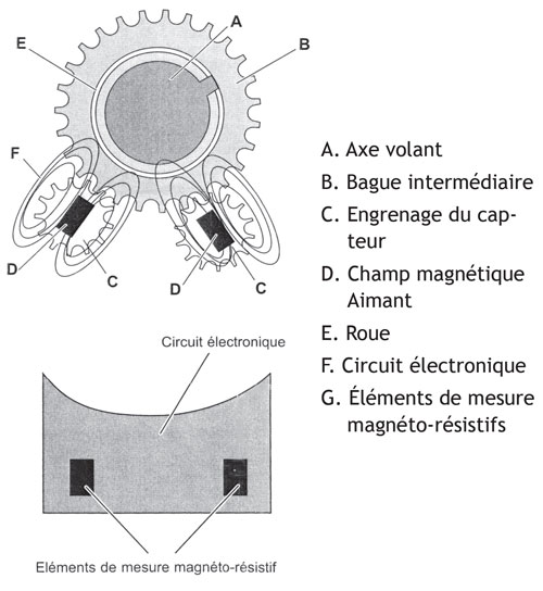 - Deux roues munies chacune d'un aimant, engrenées à la roue principale et qui ont, l'une par rapport à l'autre, une dent de différence. Cet écart se traduit par une vitesse de rotation différente des deux roues. La position des deux roues détermine la position du volant de butée en butée. Des éléments magnéto résistifs permettent la mesure et un microprocesseur calcule la valeur angulaire de freinage.