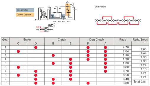 Les ingénieurs de chez ZF ont conçu une chaine cinématique. A la différence des boîtes 6 et 7 rapport, la boîte 9 n'utilise pas une base de train Ravigneaux, mais un assemblage astucieux de 4 trains simples. Un couple de trains partage un planétaire commun et ont une liaison entre un porte satellite et une couronne alors que l'autre paire de trains est concentrique. En effet La couronne du train central sert de planétaire au train extérieur. Un montage inédit.