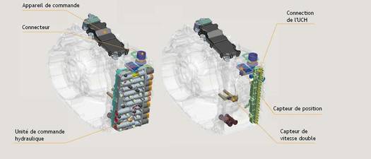 Comme dans de nombreuses boîtes actuelles, le calculateur qui gère le système est attaché au distributeur hydraulique. Ce concept est appelé « Mécatronic ». Il permet d'éliminer une partie du faisceau électrique.
