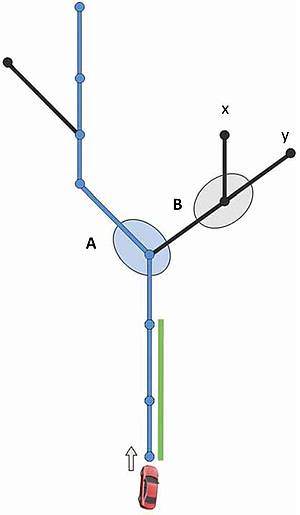 Dans le schéma si dessus, le calculateur sera sur la stratégie de passage de rapport du trajet (y). Si le conducteur bifurque en (x), le calculateur se trouvera dans une situation d'adaptation, le confort et la consommation ne seront pas optimum.