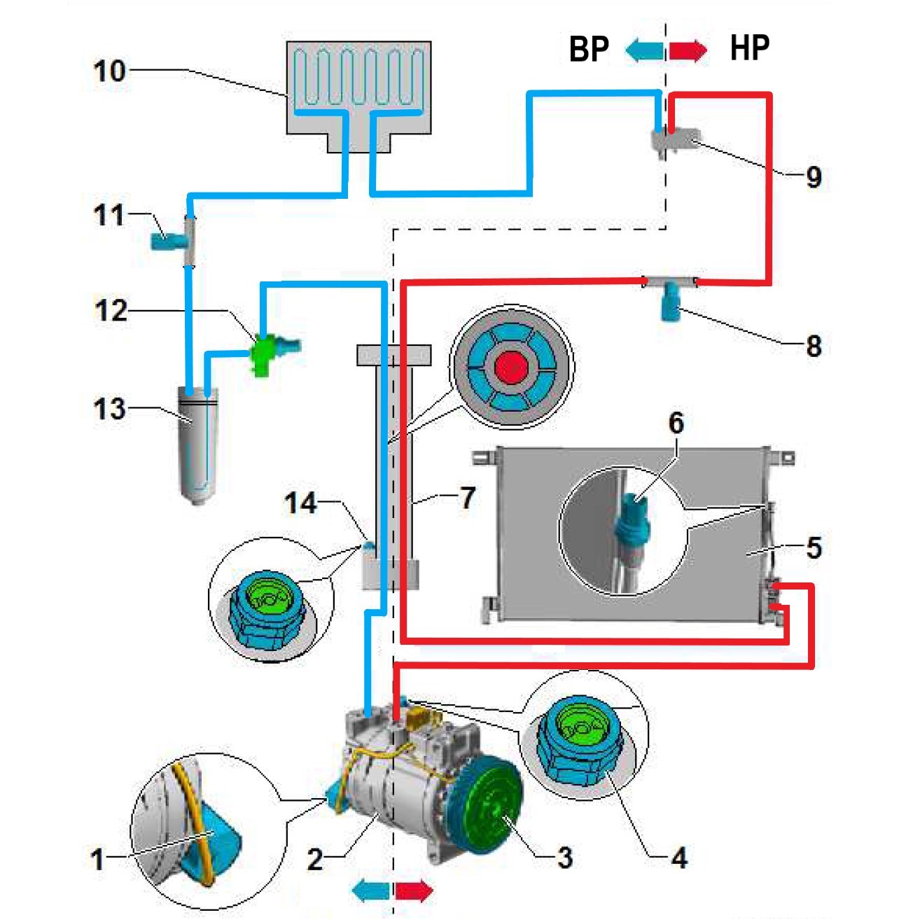 Les pressions de fonctionnement d'un circuit de climatisation au R744 sont beaucoup plus élevées que celles d'un circuit de climatisation habituel, la haute pression (HP) est au maximum de 130b et la basse pression (BP) peut varier de 29 à 39b.