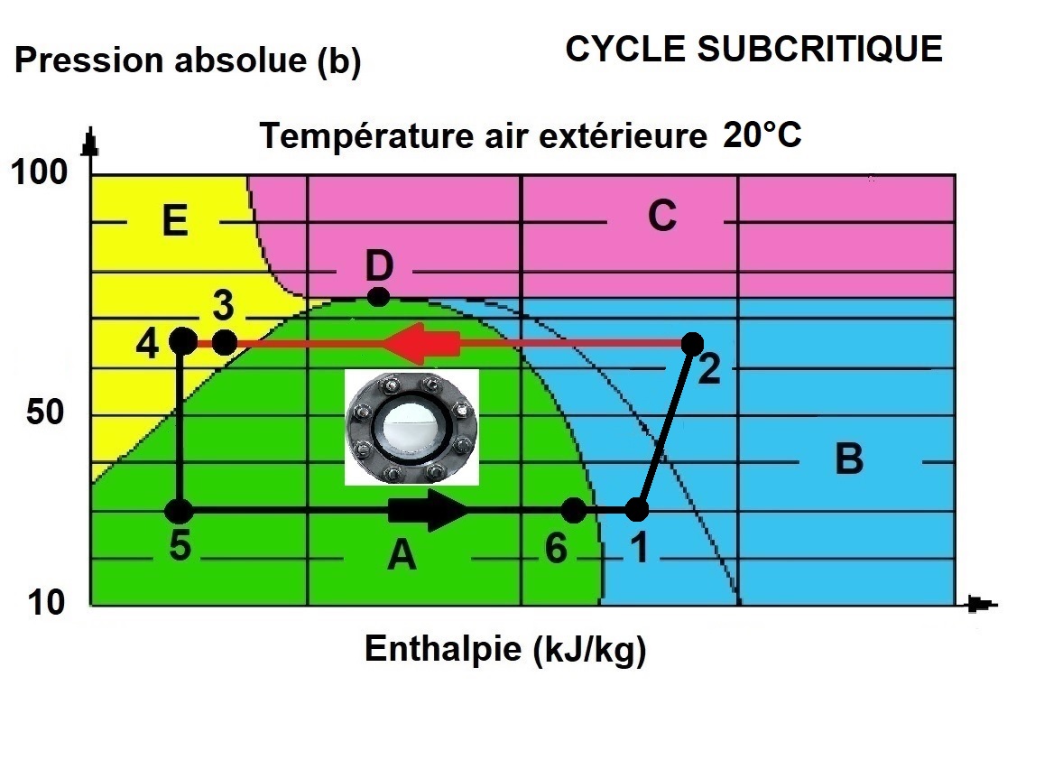 Le fluide traverse l'échangeur à l'état subcritique; la transformation se fait en dessous du point critique du R744 (73,6b et 31°C), le fluide se trouve à la fois à l'état liquide et gazeux pendant le changement d'état (zone verte sur le diagramme de Mollier).
