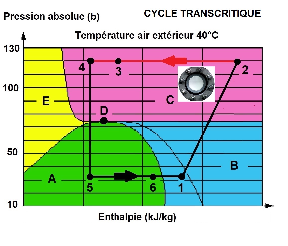 Le fluide traverse l'échangeur à l'état transcritique; la transformation se fait au dessus du point critique du R744 (73,6b et 31°C), le fluide se trouve à l'état supercritique pendant le changement d'état (zone violette sur le diagramme de Mollier).
