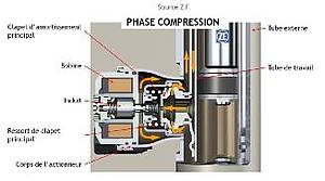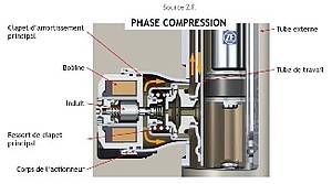 La bobine est alimentée par un courant d'une valeur de 0,24 A. Sous l'effet du champ magnétique, la tige de poussée se déplace, comprimant ainsi le ressort situé entre le plateau de commande et le tiroir de commande. L'huile a plus de facilité à traverser le plateau de commande étant donné la forme de la tête de poussée. L'amortissement est souple.