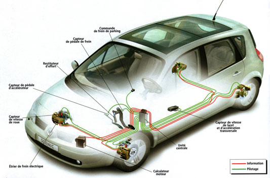 L'EMB intègre l'antipatinage (ASR) ainsi que la correction de trajectoire (ESP). Les capteurs sont identiques à ceux d'un ESP classique. Le contacteur de pédale de frein est remplacé par un capteur de pédale de frein qui donne la vitesse d'enfoncement et la course de cette dernière.