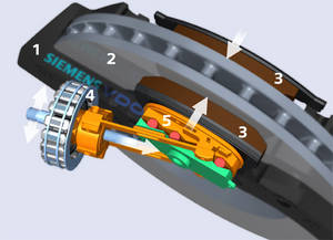 L'actionneur est un moteur électrique (4) qui actionne une vis sans fin. Celle-ci pousse un coin d'écartement (5) qui ressert les plaquettes de freins sur le disque.