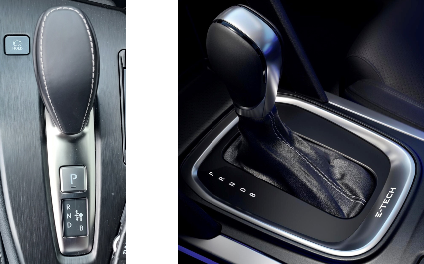 Que ce soit sur les véhicules électriques ou sur les véhicules hydrides, les leviers de vitesses sont semblables à ceux des véhicules thermiques à boite de vitesses « automatiques » avec en plus une position « B » pour le freinage régénératif.