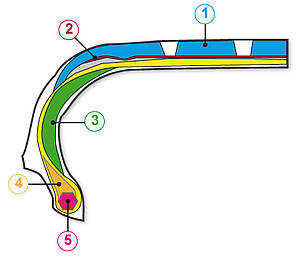 Comme le montre l'illustration, le flanc n'est pas la seule partie du pneumatique à avoir été renforcée. En effet, le talon et la tringle ont également été modifiés pour éviter le déjantage. Le flanc qui supportera donc le poids du véhicule en cas de sous gonflage est constitué de deux à trois couches de gommes différentes. Pour la tringle, les fabricants ont augmenté le nombre de câbles la constituant. Il y a environ vingt-cinq câbles pour un pneumatique à flanc porteur contre une dizaine pour un pneumatique classique.
