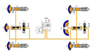 1) BHI; 2) Electrovannes de raideur; 3) Sphères principales; 4) Cylindres de suspension; 5) Sphères additionnelles; 7) Régulateurs de raideur