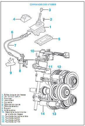 On retrouve la procédure de remplacement d'une transmission (nécessité de vidanger la boîte de vitesses ou pas), on retrouvera également la méthode de remplacement des roulements ainsi que les couples de serrage.