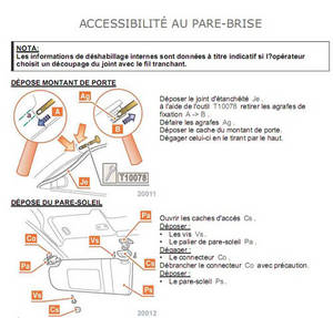 • Les vitrages : il est expliqué comment remplacer une vitre, une lunette AR ou un pare-brise.
