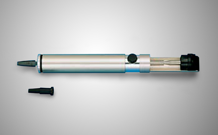 Une pompe à dessouder : il faut chauffer la soudure pour quelle soit bien liquide. Après avoir armé la pompe, mettre sa pointe en contact de l'étain à retirer et appuyer sur son bouton.
