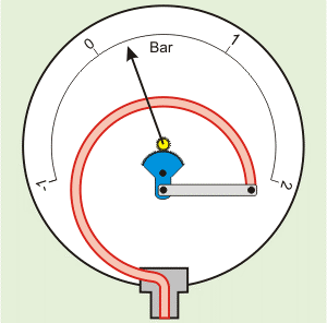 Le manomètre de Bourdon possède un tube de section elliptique qui est enroulé suivant un arc de cercle et fixé à une extrémité. Il apparaît en rouge et rose sur la figure 5. À travers son extrémité fixe, ce tube est en communication avec l'enceinte dans laquelle on veut mesurer la pression. L'autre extrémité est fermée et elle est reliée par une biellette (grise) à un secteur denté (bleu). Sous l'effet de la pression la section du tube tend à devenir circulaire, ce qui entraîne son redressement. Cette déformation est amplifiée par le palier et le pignon qui porte l'aiguille indicatrice. Bien entendu, une dépression (un vide) entraîne un mouvement inverse.